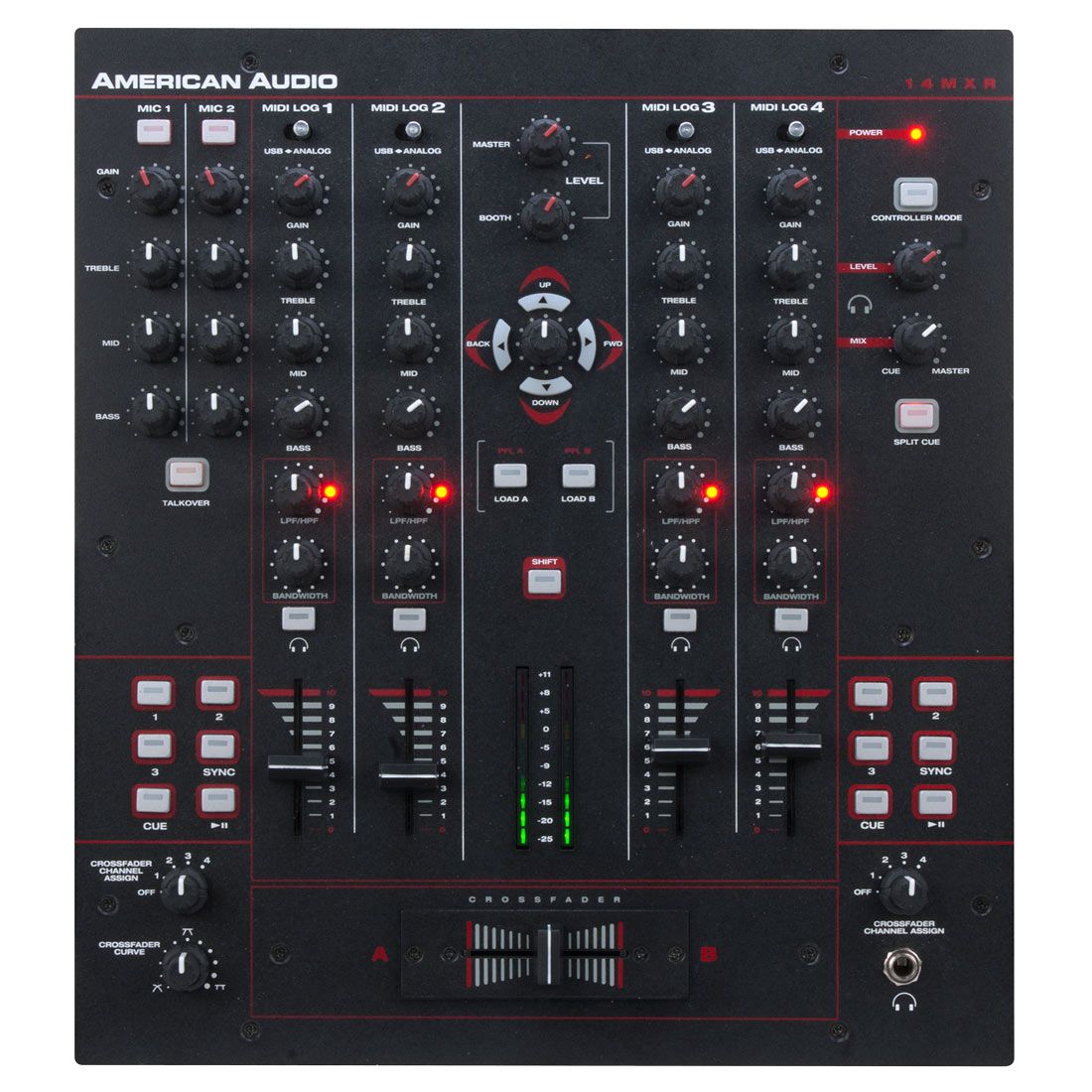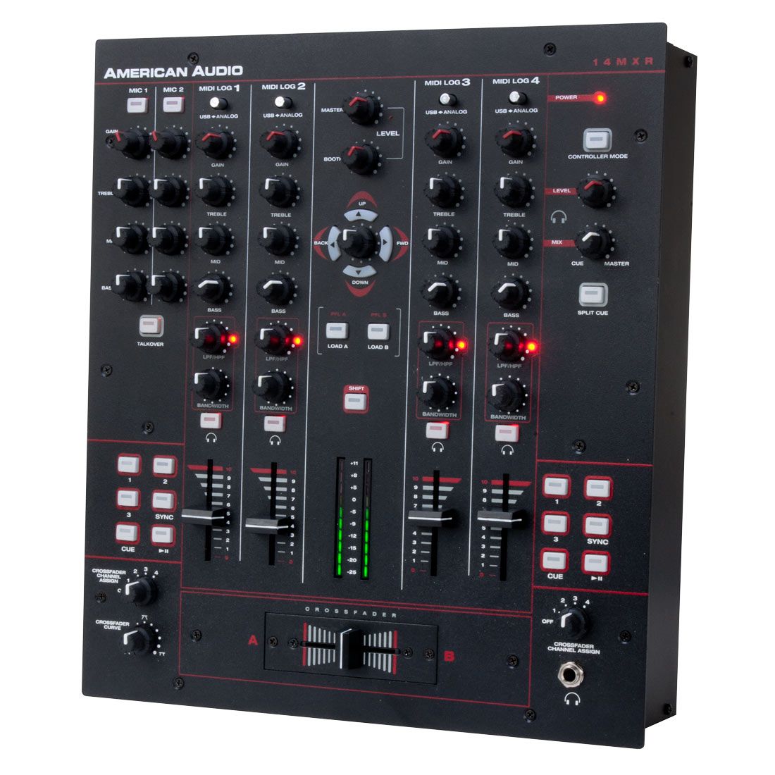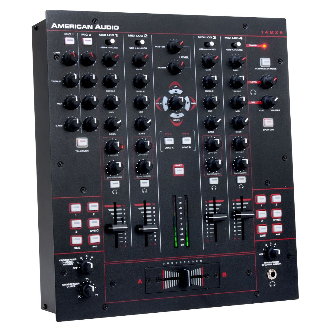 The 14MXR is a ground breaking 4-channel preamp Midi mixer with built-in 4x4 Sound Card so DJs can play and mix music from their favorite computer software, yet still have the hands-on hardware control from a compact, 4-channel mixer. Plus, with a built-in Sound Card DJs can start mixing right away without having to purchase extra equipment.