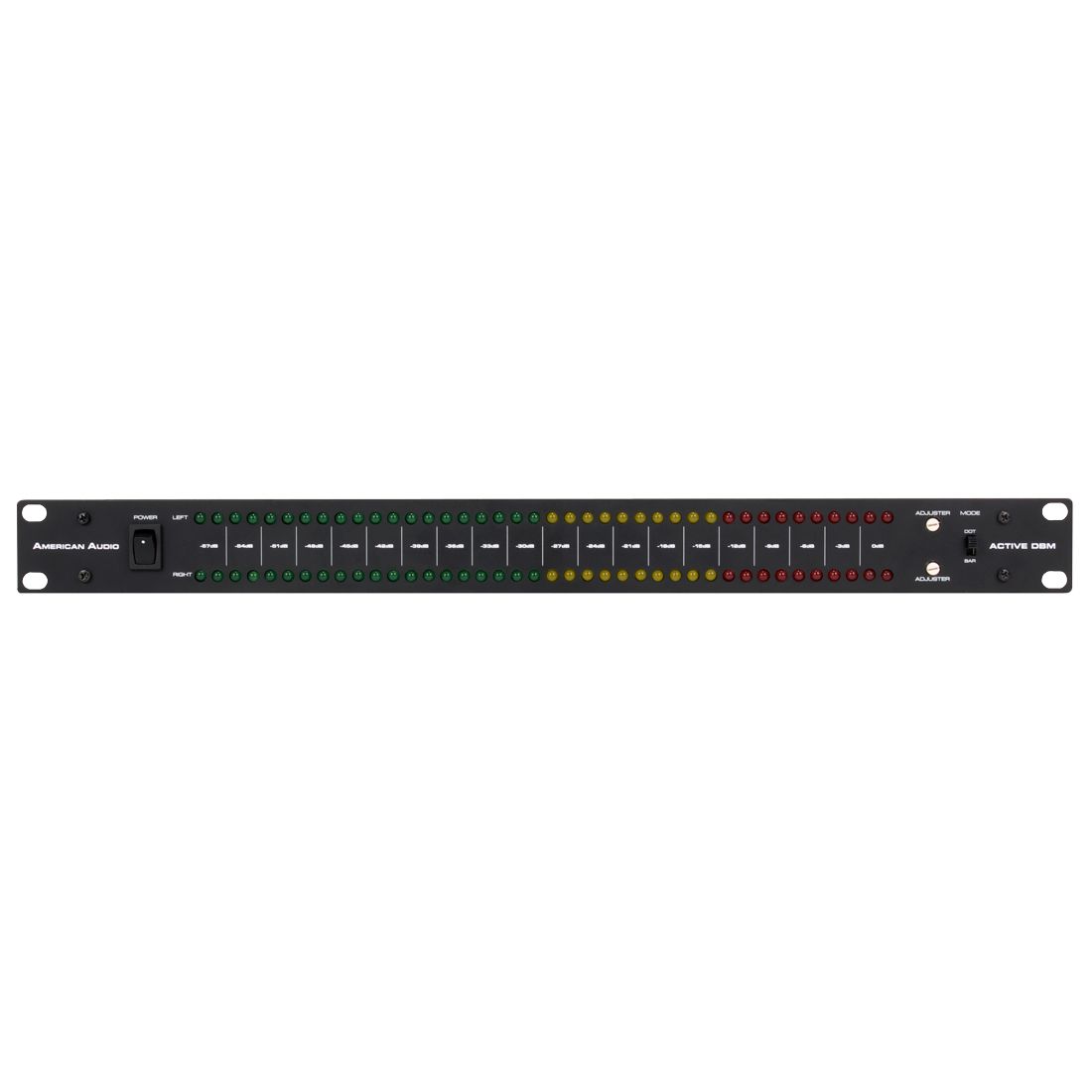 The American Audio Active DBM is a 19-inch rack-mount, LED dB meter designed to view your master decibel level and create an exciting light show in your amp rack. Active DBM features include: removable rack ears, LED dot or bar modes, RCA and Balanced XLR Ins/Outs, and a demo mode that doesn't require an audio signal for the LEDs to illuminate.
