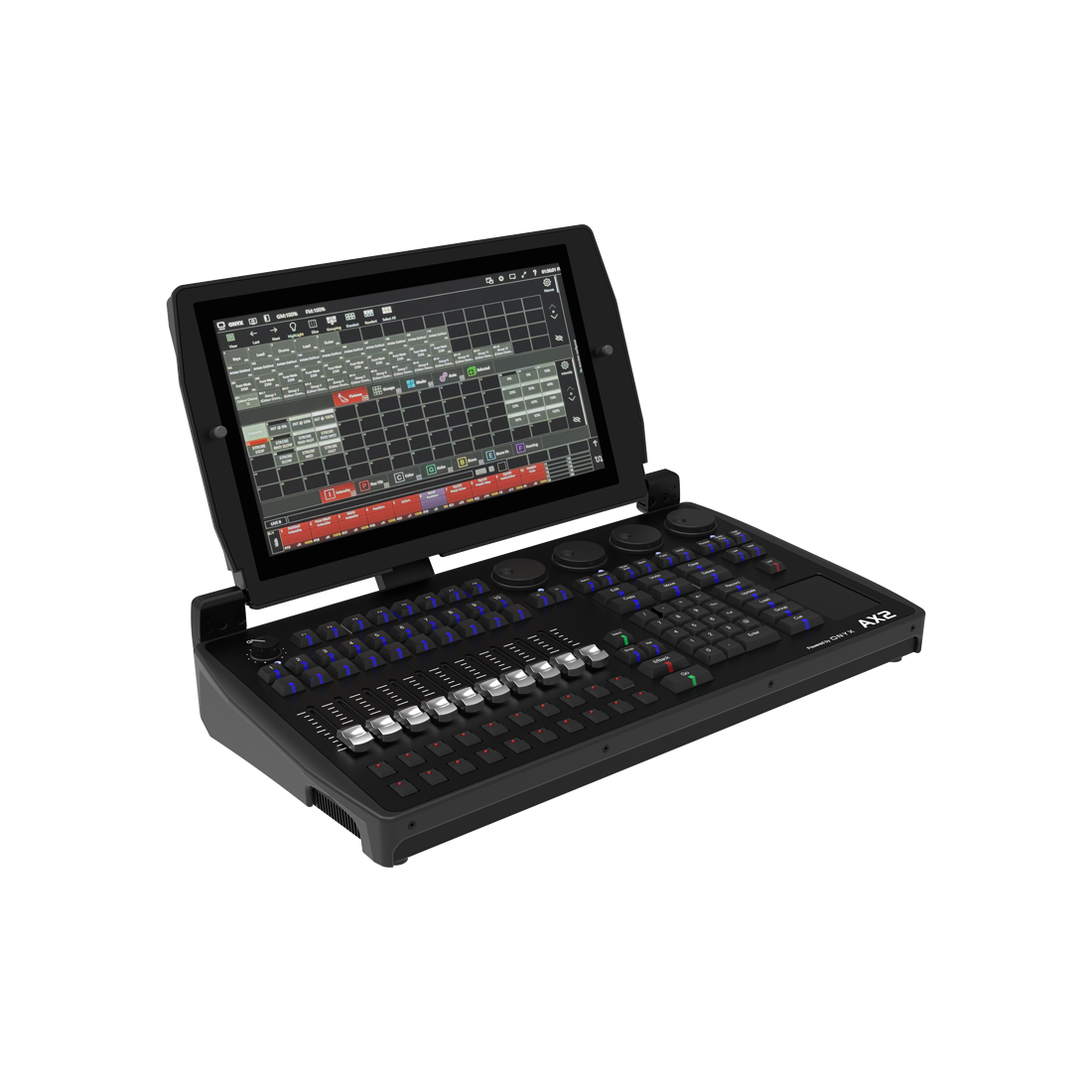 The AX2 is the ultimate compact yet powerful fully integrated lighting controller. This is the first console in the ADJ portfolio which derives from the innovative ONYX platform. The AX2 includes a high brightness Full HD multi touch screen, 8 assignable parameter encoders, an assistive mini touch screen, full keypad and command section, a dedicated grand master and 10 full playbacks with four freely assignable buttons. Utilizing the latest in industrial components the AX2 contains a powerful Intel Hexa-Core processor, high speed NVMe SSD drive and 16GB of DDR4 RAM. Fast boot times, instant operation and the ability to process 32 Universes right inside the console without the need for costly external processing networks result in unprecedented power in this form factor. The AX2 is ergonomic with its compact footprint, full ONYX command and keypad section and the bright adjustable HD touch screen. It is always ready to run the largest shows and events at a moments notice. With four DMX ports, Timecode, Midi and dual Gigabit ports for up to 32 Universes of Art-Net, sACN plus the ONYX X-Net protocol the AX2 has all the connectivity and power the ever-increasing sizes of shows demand. Two additional 4K touch monitors are supported for even more direct access at any time
