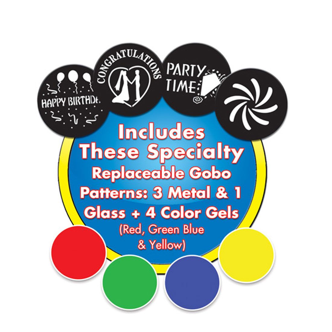 - Includes 4 replaceable gobo patterns (3 metal; 1 glass)