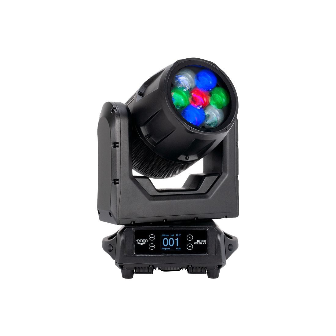 The ADJ Hydro Wash X7 is an IP65 rated 280W professional moving head wash fixture with seven 40W RGBW (4-IN-1) LEDs.