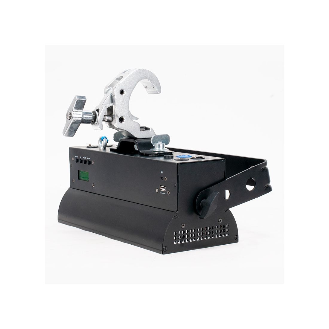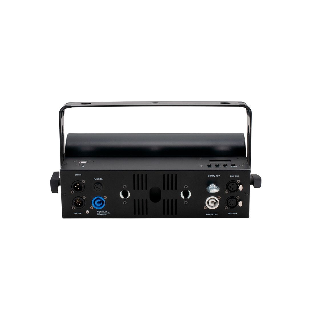 The rear panel has conveniently located connections with 3-pin and 5-pin DMX input connections along with a Locking Power input to receive power. On the other side of the rear panel are the 3-pin and 5-pin DMX outs and the locking power out connections. This enables the unit to receive and pass through power and data to another Jolt 300 fixture. There is also a USB input that allows uses a fast and convenient way to update firmware.
