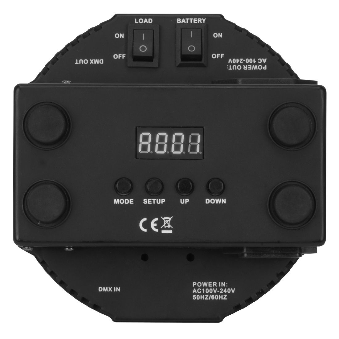 This fixture uses LEDs rated at 50,000 hours with a maximum power draw of 18W. DMX addressing may also be changed by the unit’s 4-button LED display, or controlled by a DMX Controller or the ADJ RFC RF remote control (sold separately). There is no duty cycle, plus users can “daisy-chain” the power from one unit to the next with the built-in IEC power Ins/Outs, up to 30 Mega Go Flood Pars. The built-in battery will keep a charge for up to 4.5 hours (full on) from a full, single charge.