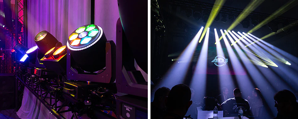 The demo room itself was thoughtfully designed and programmed by ADJ Technical Product Specialist Jeffrey Yukelson, who created a light show that highlighted each fixture’s strengths while demonstrating how they function together in a complete production environment. His programming brought the space to life, showing how movement, color, and timing could be used creatively to enhance live performances.