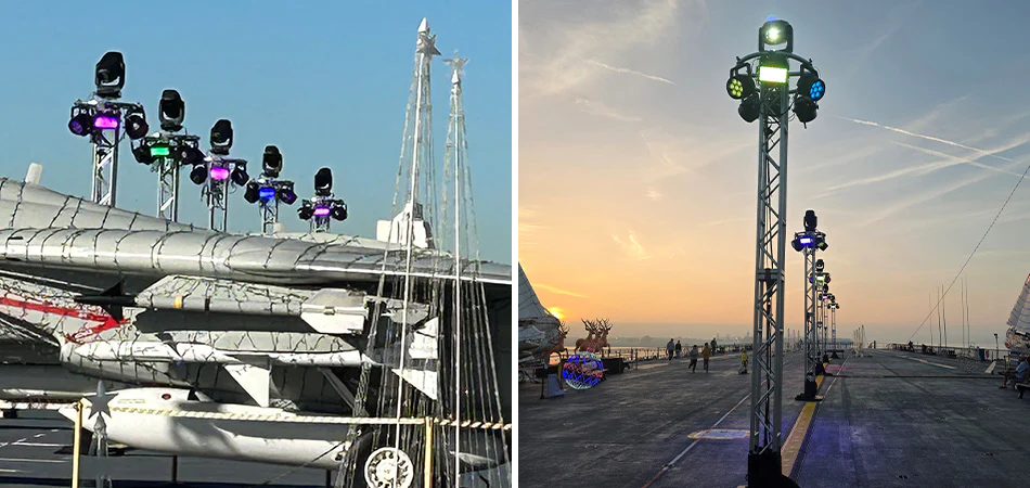 Running on select nights from November 28 through December 30, 2025, Jingle Jets delivers dazzling lighting displays, festive performances, and seasonal cheer for the whole family — all set against the truly unique backdrop of a historic aircraft carrier. With guests exploring multiple decks, including the expansive flight deck, the lighting design needed to be both visually impactful and robust enough to withstand the challenges of a large-scale outdoor environment.
