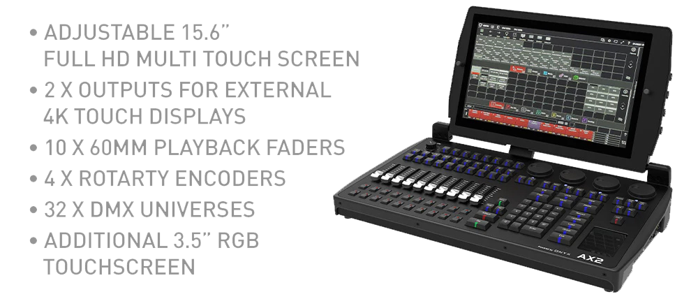 Built for designers, programmers, production companies and venues that require increased control without added complexity, the AX2 is engineered to be easy to learn, approachable for new programmers, and deeply competent for seasoned professionals. The console’s blend of tactile hardware, intuitive touchscreen navigation, powerful processing, and advanced software features make it easy to create complex looks with efficiency and confidence. Built on the solid foundation of Obsidian Control Systems’ command-line-driven ONYX software platform, it offers all the features a professional lighting designer requires in an easily portable all-in-one device. For those new to ONYX, there are a wealth of training resources and YouTube videos freely available online to help users quickly familiarize themselves with the software.