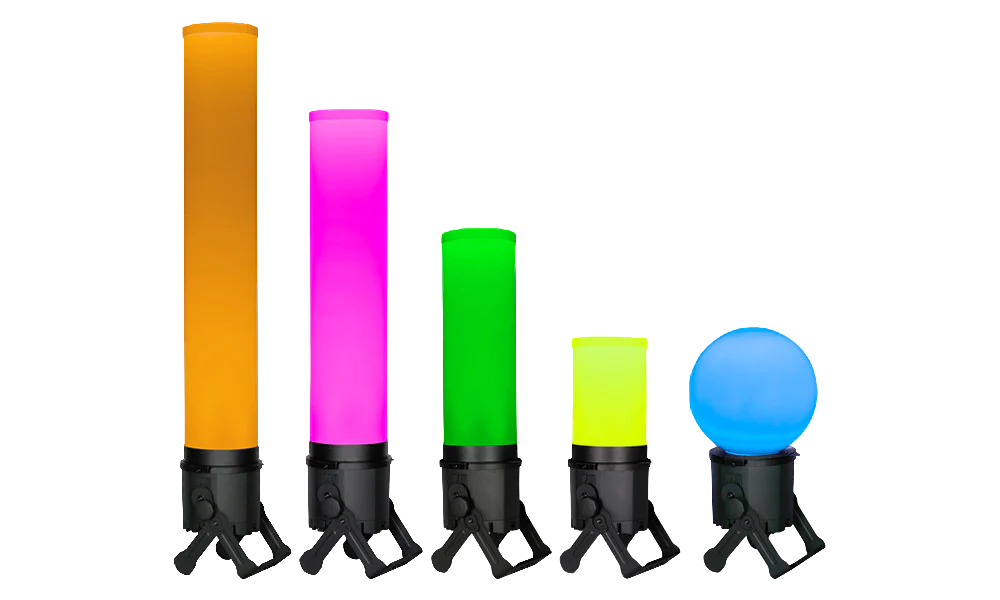 Each attachment is engineered to fit seamlessly onto the ElectraPix Par 7, transforming its high-output RGB+Lime color mixing into immersive columns or spheres of glowing light. The frosted finish ensures smooth, even diffusion, eliminating hot spots and creating a soft, radiant glow ideal for stage, event, architectural, and entertainment applications.