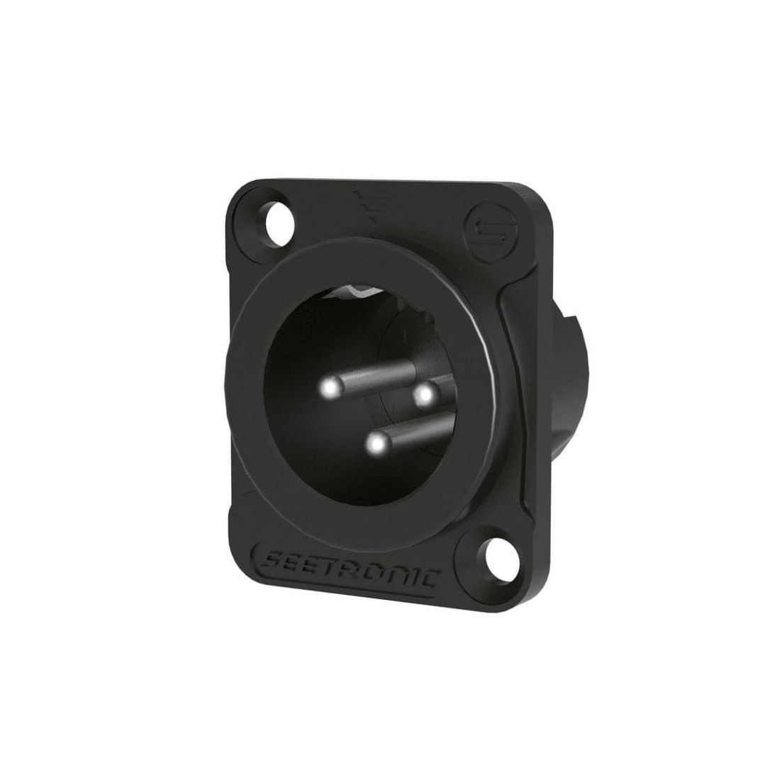 Seetronic MJ3F2C-B is a professional 3-pin XLR male panel socket designed for reliable signal connections in audio, lighting, and control systems. Built with a durable zinc alloy housing with black plating and silver-plated contacts, it delivers excellent conductivity and consistent performance for professional audio and DMX applications.
