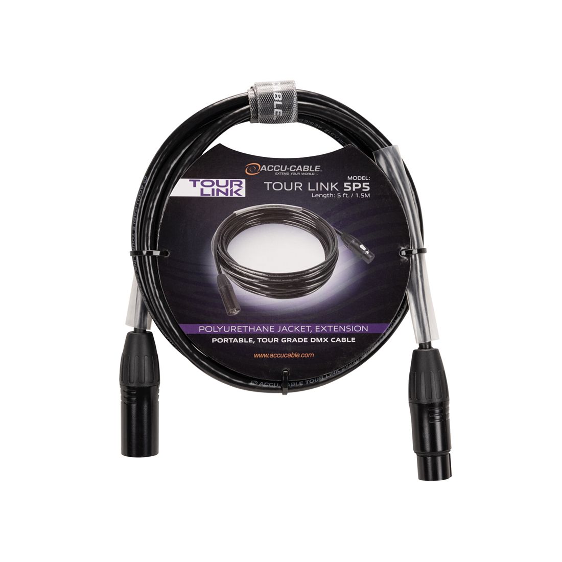 Tour Link 5P 1,5m, part of the Accu-Cable Tour Link Series, is a professional grade 1,5 meter, 5-pin male to 5-pin female DMX cable. Includes velcro strap, clear heat shrink tube and length stamped on connectors.