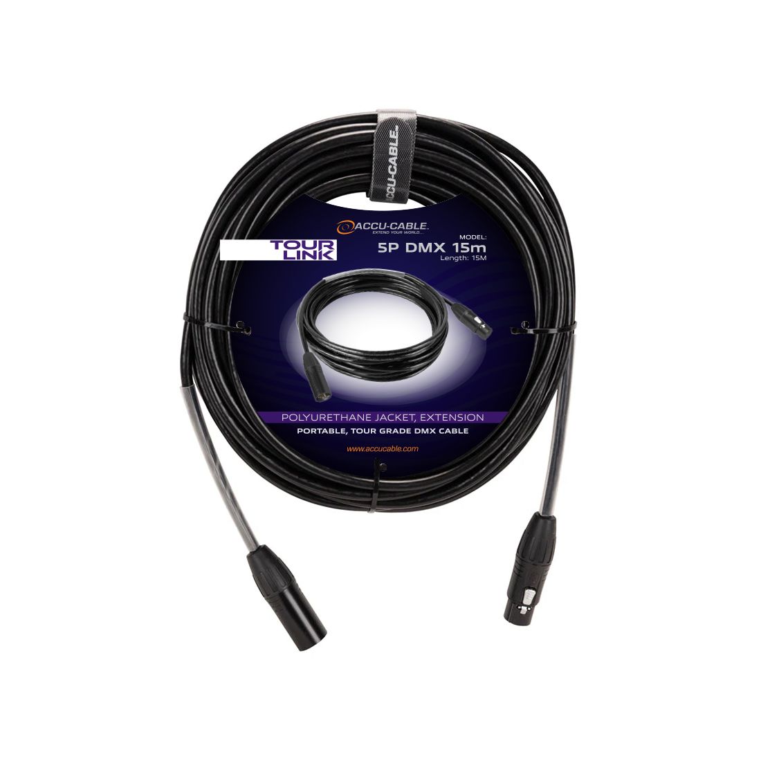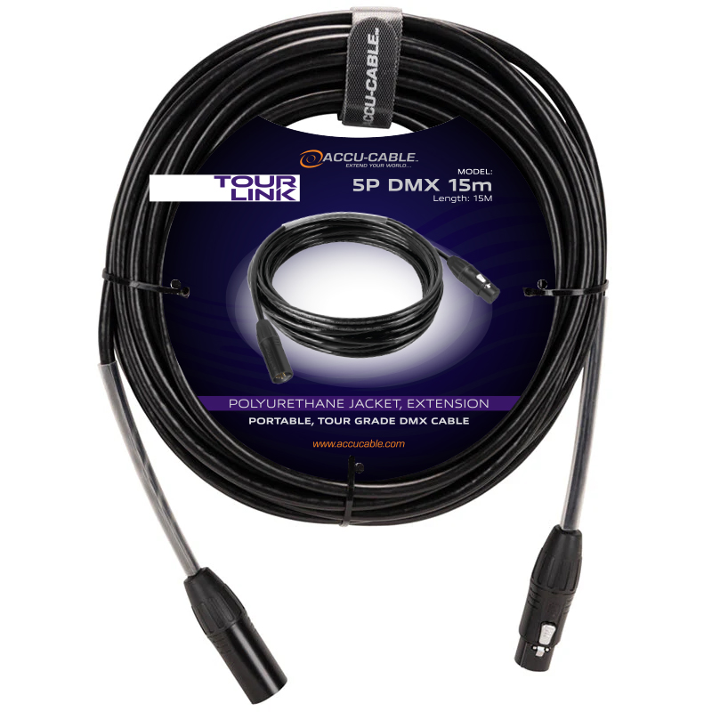 Tour Link 5P 15m, part of the Accu-Cable Tour Link Series, is a professional grade 15 meter, 5-pin male to 5-pin female DMX cable. Includes velcro strap, clear heat shrink tube and length stamped on connectors.
