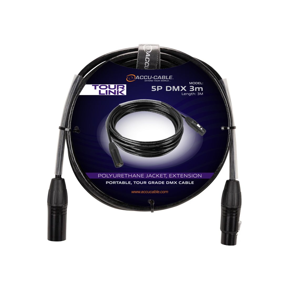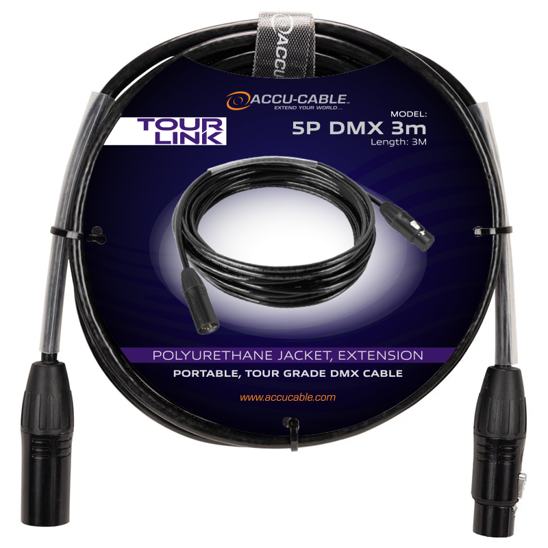 Tour Link 5P 3m, part of the Accu-Cable Tour Link Series, is a professional grade 3 meter, 5-pin male to 5-pin female DMX cable. Includes velcro strap, clear heat shrink tube and length stamped on connectors.