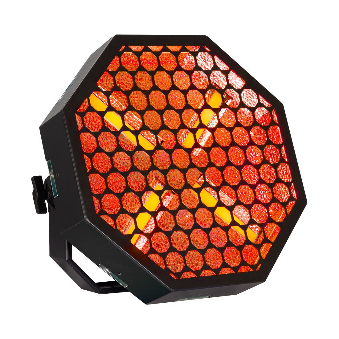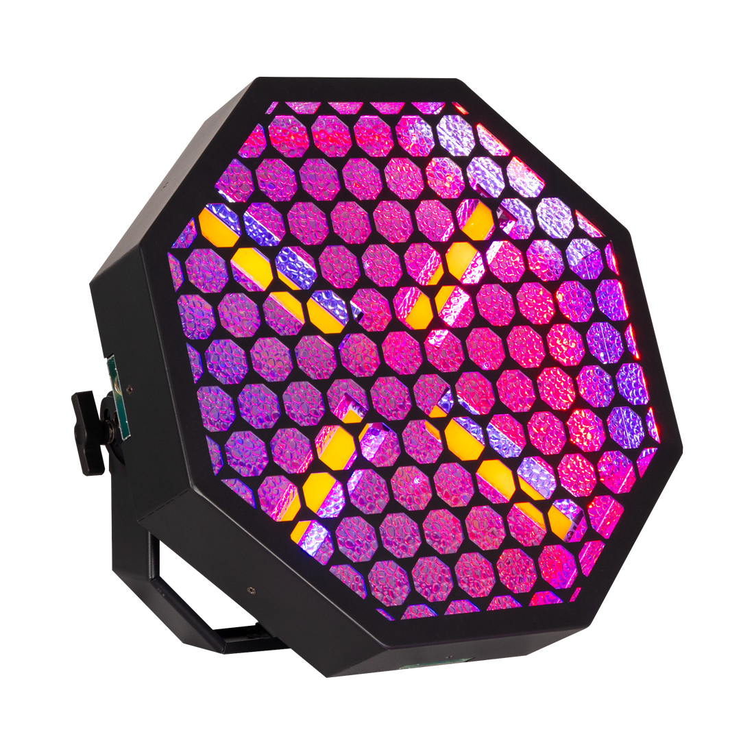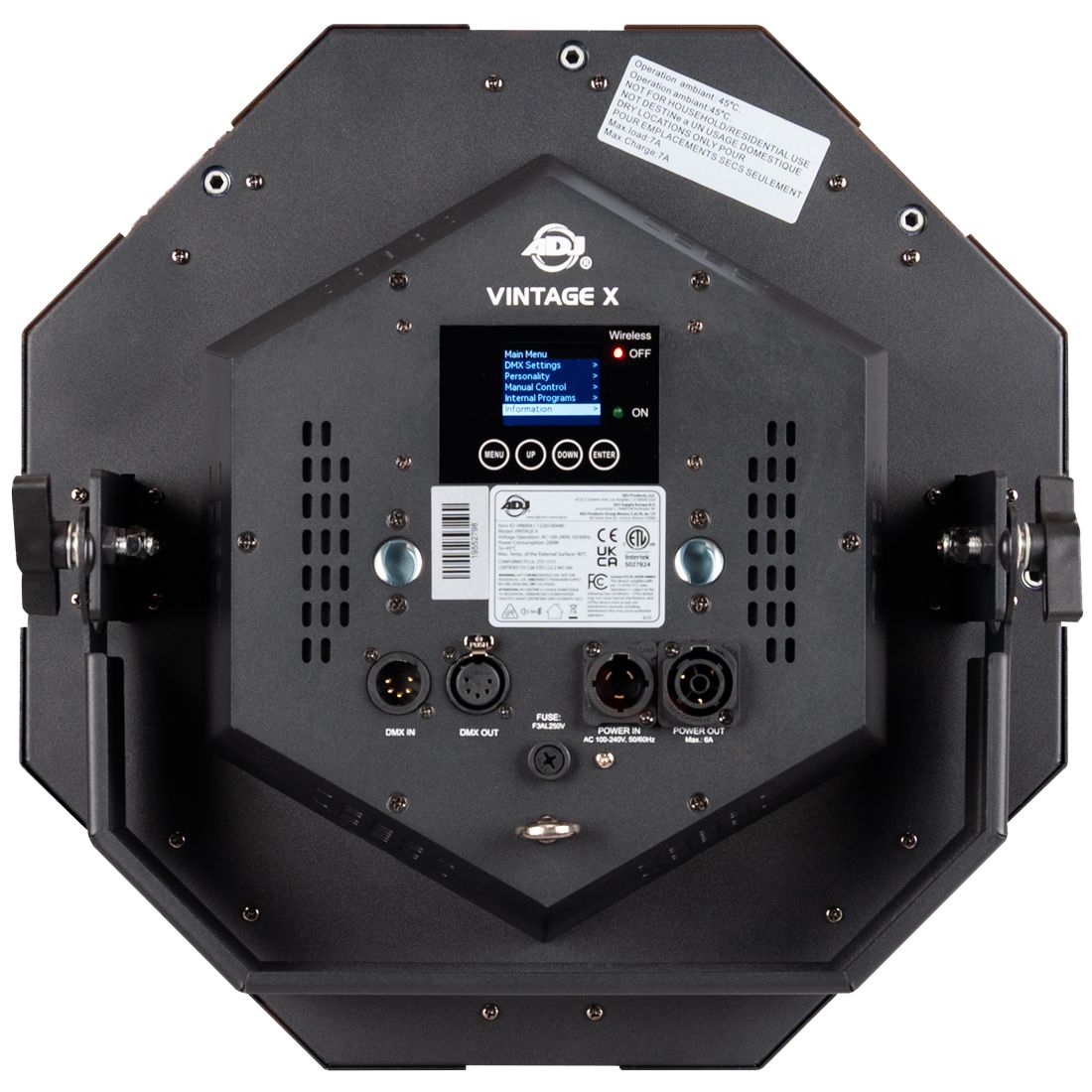 Vintage X is a highly adaptable scenic lighting fixture that sparks creativity and captures attention with its dual-purpose design. Featuring four 60-watt foreground amber LEDs (2000K), it emulates the warm glow of tungsten for a retro blinder effect, while 64 vibrant 3-watt RGB LEDs deliver rich, dynamic color tones and stunning effects. This combination allows for smooth dimming transitions and bold, captivating lighting displays in an intriguing octagon shaped fixture.