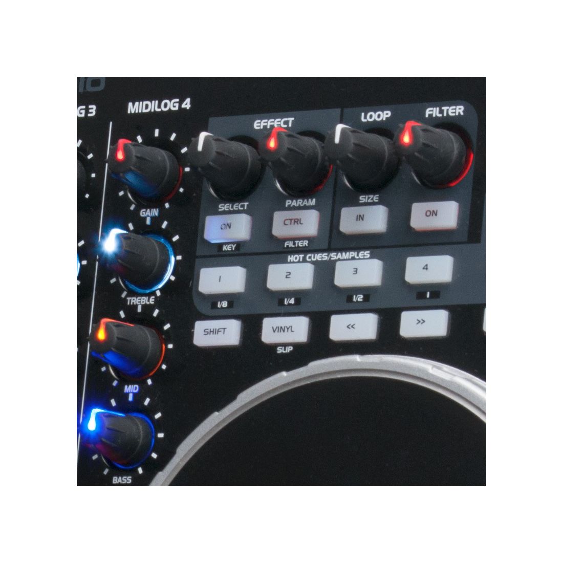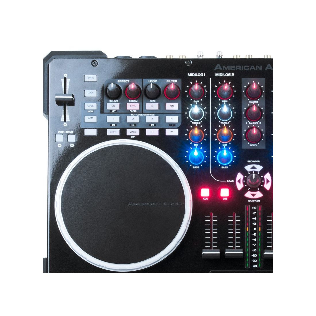 - MIDI FEATURES:- Two 10- bit resolution pitch sliders- 62 assignable MIDI buttons and switches- 50 MIDI buttons have LED illuminations, including 18 with dual blue/red LEDs- 4 assignable rotary encoders- 34 assignable rotary controllers- 5 assignable linear fader controllers- Dual MIDI controls on all buttons and switches- Dual 2000 point resolution touch sensitive turntable scratch controllers