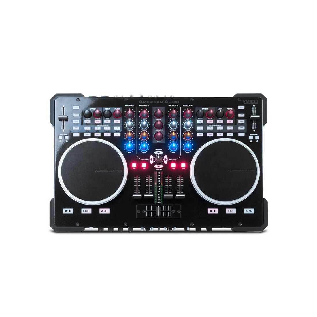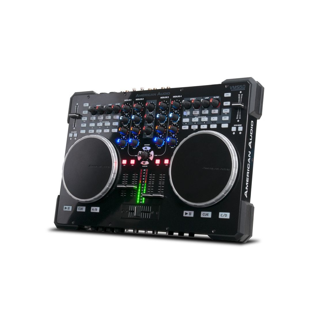 The American Audio VMS5 is one of the most comprehensive DJ Controller ever designed for performance minded DJs looking for a solid, all-in-one Midi Controller to control their software and music from their laptop (4 Deck and 2 Deck DVS!), plus have option to use the stand alone mixer as a tradition analog mixer with 4 line inputs, 2 Phono inputs and 2 Microphone inputs. In addition, some general features include 4 USB / Analog selectable Midilog (Midi & Analog) channels, gain/treble/mid/bass EQ on all MIDILOG channels.